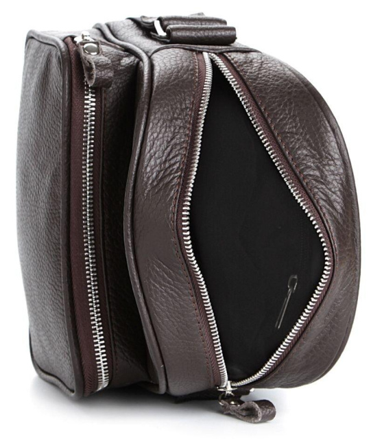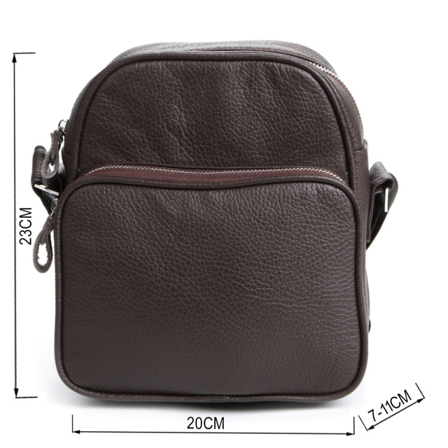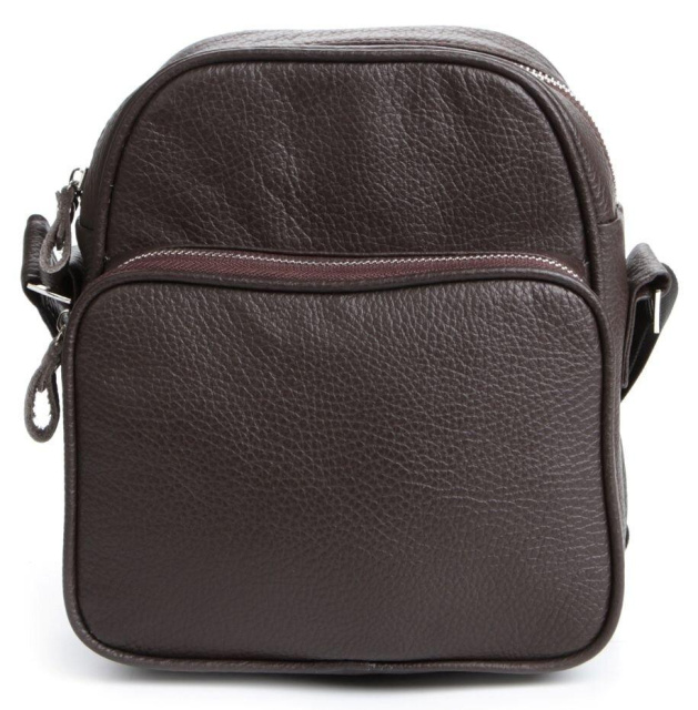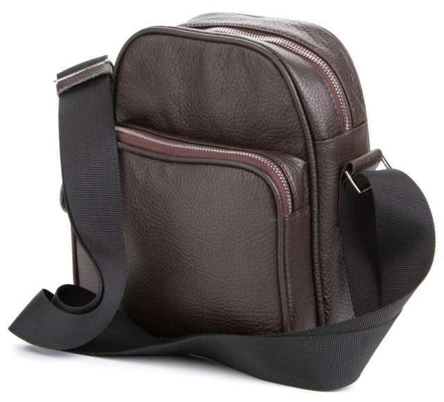 Країна виробник: Україна. Сучасна чоловіча шкіряна сумка темно-коричневого кольору. Аксесуар виконаний зі шкіри флотар, яка відрізняється "зернистою" фактурою. Колір фурнітури: срібло. Сумка носиться через плече за допомогою регульованого плечового ременя, який виконаний з міцного текстильного матеріалу. Особливості: