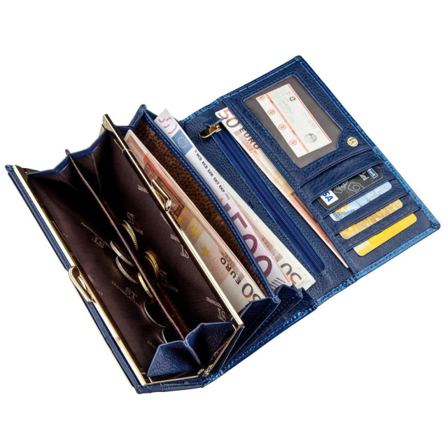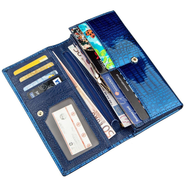 - зовнішнє потаємне відділення на всю довжину; Вишуканий жіночий гаманець в класичному стилі для жінок будь-якого віку. Зроблено аксесуар з натуральної першосортної шкіри, яка м'яка і гладка на дотик, а також покрита лаком. Тому виглядає дуже красиво і шикарно. Колір гаманця насичений синій з блакитним відтінком. Наповнення гаманця теж можна сказати - класичне. Це відділення для купюр і банкнот, для необ'ємних документів, відділення для монет та інших дрібниць, а також кишені для візитних і кредитних карт. Данний аксесуар неодмінно стане відмінним подарунком не тільки самій собі, а й для іншої близької людини, особливо якщо є привід. Упаковка представлена у вигляді щільної фірмової картонної коробки. ОПЛАТА та ДОСТАВКА : накладний платіж з передоплатою 200 грн.Терміни відправлення : 1-3 робочих днів