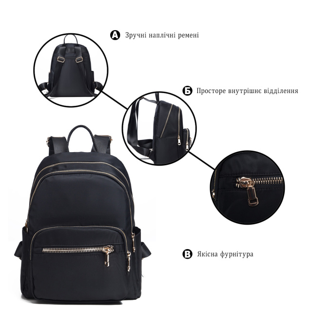 - кишеня на блискавці на тильній стороні. Сучасний жіночий рюкзак компактного розміру на кожен день. Аксесуар має оригінальний класичний дизайн, який не прив'язує вас до певного стилю. Модель доповнена блискучою золотистою фурнітурою і дуже приємна на дотик. В аксесуар легко поміститься косметичка, гроші, щоденник або улюблена книга, а також інші необхідні жіночі дрібниці. Дуже хороша модель на кожен день. Рюкзак виконаний з щільного нейлону і прослужить вам порівняно довго. Незважаючи на свій невеликий розмір аксесуар дуже вмісткий і зручний. Рюкзак буде ідеальним подарунком для будь-якої дівчини. ОПЛАТА та ДОСТАВКА : накладний платіж з передоплатою 200 грн.Терміни відправлення : 1-3 робочих днів