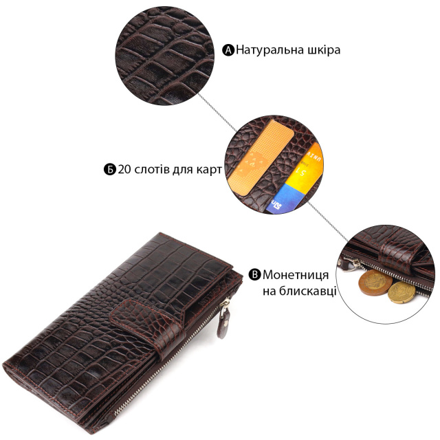 - гаманець упакований у фірмову коробочку. Місткий жіночий гаманець з натуральної фактурної шкіри з тисненням під крокодила. Аксесуар має шість прилеглих кишень, у які помістяться купюри всіх номіналів, містку монетницю та двадцять кишень для карток. Закривається аксесуар хлястиком на кнопку. Якщо Ви хочете порадувати себе та здивувати близьких, то неодмінно купуйте шкіряні аксесуари в нашому магазині, якість і ціна Вас однозначно порадує. ОПЛАТА та ДОСТАВКА : накладний платіж з передоплатою 200 грн.Терміни відправлення : 1-3 робочих днів