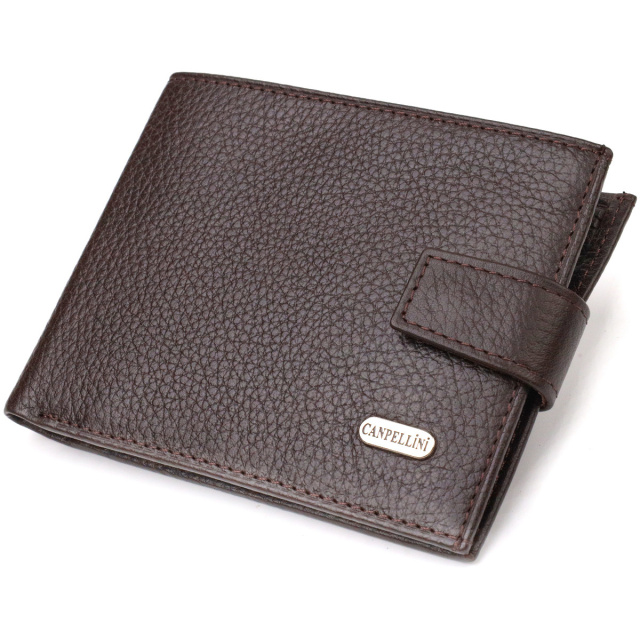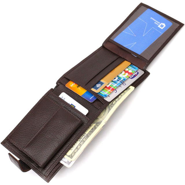 - гаманець упакований у фірмову коробочку; Надійний чоловічий гаманець середнього розміру із натуральної зернистої шкіри флотар. Аксесуар має основне відділення для купюр з перегородкою, чотири осередки для карток, дві кишені під сіточкою, три прилеглі кишені та монетницю. Гаманець складається навпіл, закривається хлястиком на кнопку. На лицьовій стороні в правому нижньому кутку розташований металевий логотип компанії виробника. Купуючи шкіряний гаманець у нашому магазині, Ви отримуєте модний, стильний аксесуар, який прослужить не один рік. ОПЛАТА та ДОСТАВКА : накладний платіж з передоплатою 200 грн.Терміни відправлення : 1-3 робочих днів
