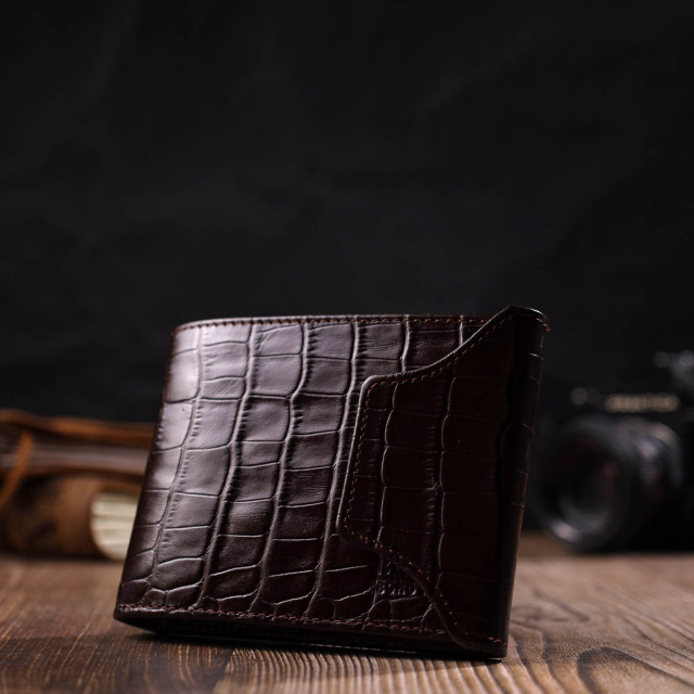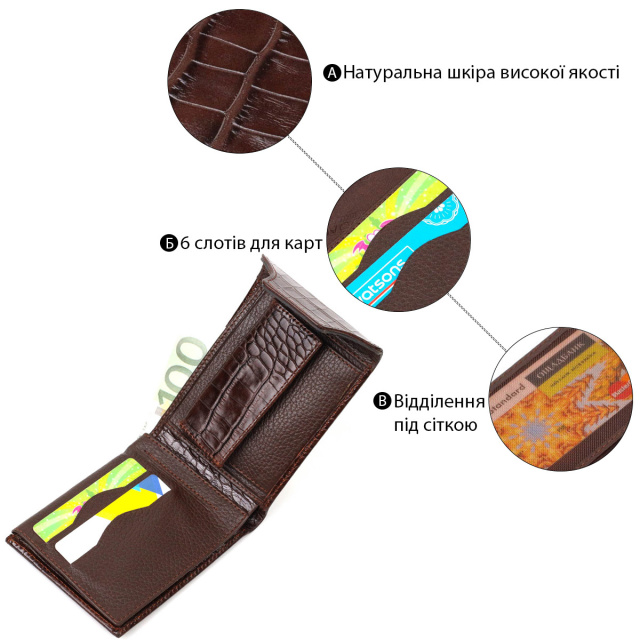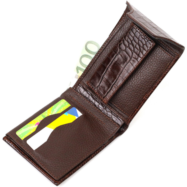 - виріб упакований у фірмову коробку. Гаманець середнього розміру, горизонтального типу, виготовлений з добротної натуральної шкіри, з тисненням під крокодила. У цей аксесуар чудово поміщаються купюри всіх номіналів. Виріб складається з двох відділень для купюр, шести осередків для кредиток, п'яти прихованих кишень, монетниці та одного відділення під сіткою під документи. Закривається гаманець навпіл клапаном на кнопку. Вироби з натуральної шкіри завжди будуть чудовим подарунком для близької людини. ОПЛАТА та ДОСТАВКА : накладний платіж з передоплатою 200 грн.Терміни відправлення : 1-3 робочих днів