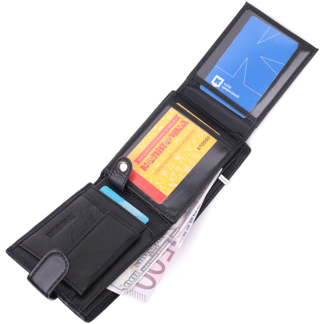 - закривається хлястиком на кнопку. Цікавий гаманець для чоловіків, які цінують якість та практичність. Аксесуар з натуральної шкіри, він складається з двох містких відділень для купюр, кишені на блискавці, чотирьох кишень під плівкою, комірки для карт, трьох прихованих кишень та кишені для монет. Портмоне доповнено надійною фурнітурою та міцною підкладкою. Запакований гаманець у фірмову картонну коробку білого кольору.
