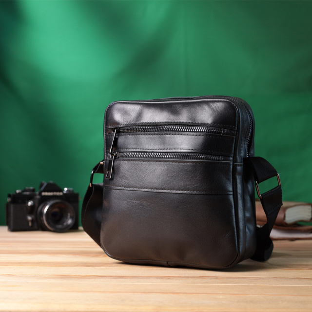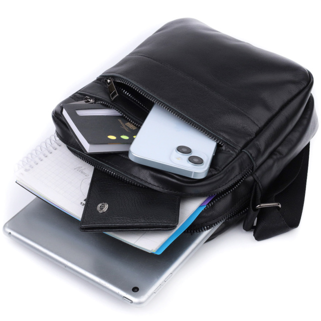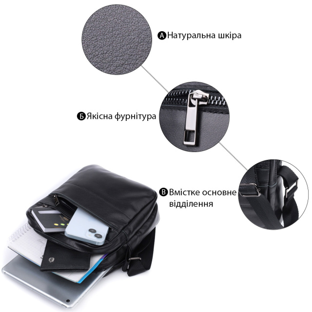 - підкладка із чорної тканини. Цікава чоловіча сумка месенджер, з великою кількістю кишень, в яку помістяться всі необхідні речі і навіть міні айпад. Чудова чоловіча сумка вертикального формату виготовлена з натуральної гладкої шкіри чорного кольору. Фурнітура металевого кольору - стійка не змінює свій колір у процесі носіння. Аксесуар чудово поєднується з усіма стилями в одязі та може стати чудовим подарунком на будь-яке свято. ОПЛАТА та ДОСТАВКА : накладний платіж з передоплатою 200 грн.Терміни відправлення : 1-3 робочих днів