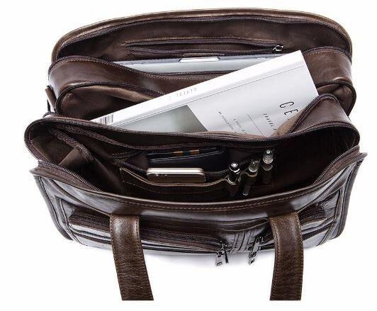 - текстильна ручка зі шкіряною вставкою, що знімається. Стильна сумка для ноутбуку в коричневому кольорі. Аксесуар виконаний з натуральної телячої шкіри високої якості. Сумка доповнена різноманітними кишенями для найнеобхіднішого. Аксесуар красиво переливається на сонці. Переплачуючи за шкіряну сумку ви не пошкодуєте, так як вона прослужить вам дуже довго. Шкіра дуже невибаглива в догляді і при цьому довго носиться. Модель додасть завершеності вашому образу і підійде під будь-який стиль. Буде чудовим подарунком для близької людини.