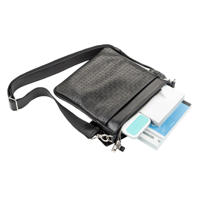 На задній, зовнішньої, стінці аксесуара розташована прорізна кишеня на застібці, яка прикрита шкірою. Обсяг сумки збільшується за допомогою блискавки на її гранях.