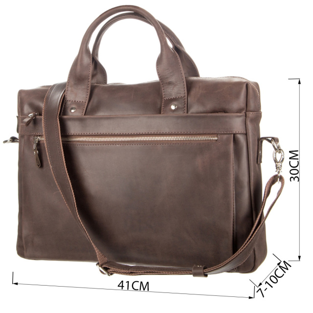 Міцна чоловіча сумка - з вінтажної шкіри високої якості, іноді її називають crazy horse або просто crazy, для неї характерні потертості, штучні подряпини і неоднорідність забарвлення. Через це вироби з такої шкіри довше тримають презентабельний зовнішній вигляд. З додаткових матеріалів, встановлена надійна металева фурнітура, а для підкладки взято міцний текстиль.