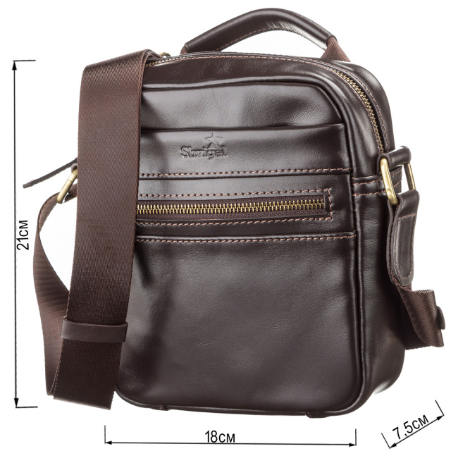 - аксесуар упакований в пилозахисний чохол. Компактна чоловіча сумка з натуральної високоякісної гладкої шкіри. Аксесуар прошитий світлою ниткою, що надає виробу міцності і оригінального вигляду. Даний аксесуар не тільки функціональний у використанні, але і доповнює елегантний образ сучасного чоловіка. Розмір сумки невеликий, але вмісткий і дуже зручний.