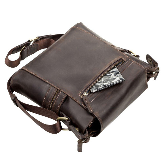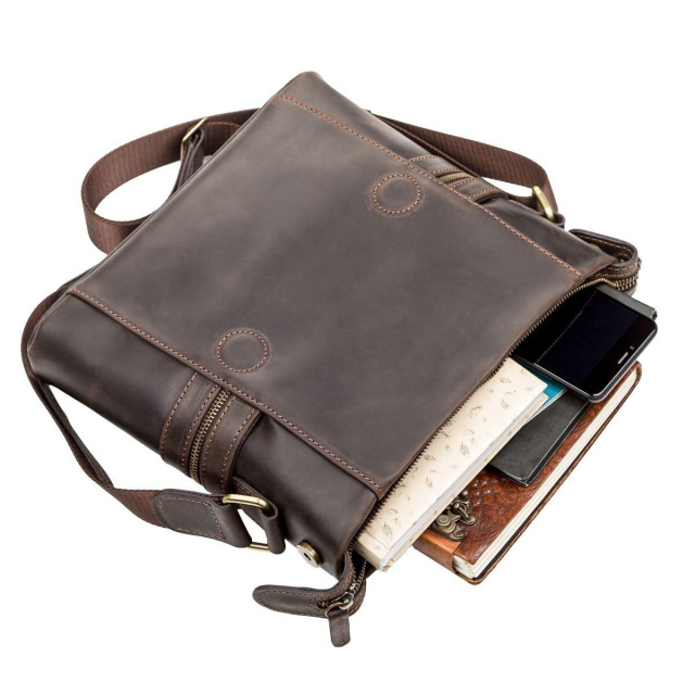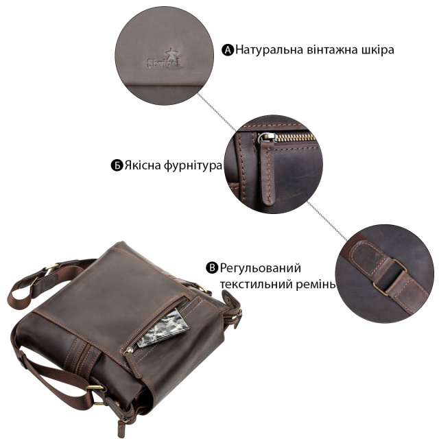 - аксесуар упакований в пилозахисний чохол. Відмінна чоловіча шкіряна сумка, з натуральної вінтажної шкіри, через плече, середнього розміру з клапаном. Вмістка і зручна. У неї можна помістити зошит, планшет, телефон та інші дрібниці.