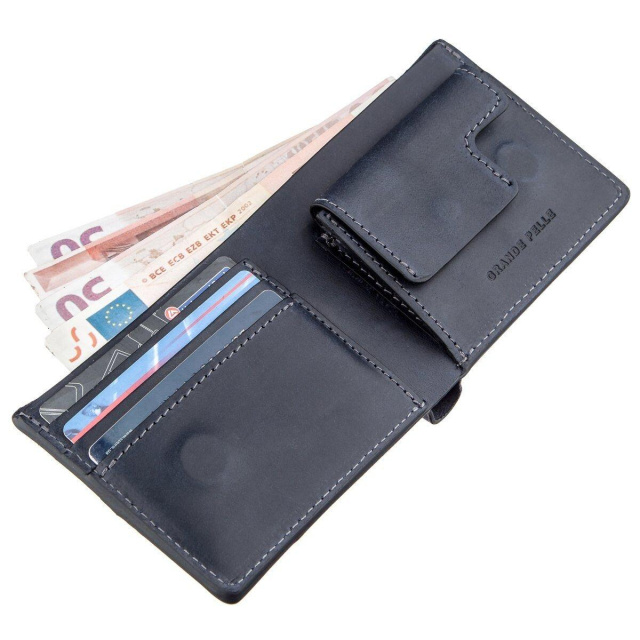 - закривається на магніти. Чудове портмоне ідеально підійде як чоловіку, так і жінці. Спокійний синій колір не поступається популярності чорному або коричневому. Аксесуар виготовлений виключно з натуральної італійської шкіри найвищої якості. На лицьовій стороні виріб має тиснення логотипу бренду виробника. По краях дизайн прикрашає рівна строчка синього кольору. Закривається аксесуар надійним магнітом. Портмоне стане ідеальним подарунком для близької людини. Модель упакована у фірмову картонну коробку.