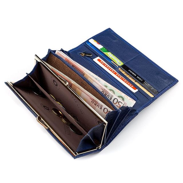 1 відділення, яке закривається блискавкою. Представлений гаманець має привабливий зовнішній вигляд з елегантним синім кольором і виготовлений з якісної, зносостійкої шкіри, що має зернисту фактуру. Закривається аксесуар клапаном, який надійно фіксується на магнітах, розташований в кутку кожної зі сторін. Внутрішній простір досить великий: відділення, кишеньки, слоти, які мають гарну місткість. Є також і монетниця на застібці, а також зовнішня відкрита кишеня для різних невеликих речей. Вся фурнітура надійна і оформлена в золотистому кольорі, а додатковим бонусом стане приваблива фірмова коробка з логотипом виробника. Якщо потрібні функціональні і якісні аксесуари, слід звернути увагу на сайт нашого інтернет-магазину, де є відмінна продукція за доступними цінами. ОПЛАТА та ДОСТАВКА : накладний платіж з передоплатою 200 грн.Терміни відправлення : 1-3 робочих днів