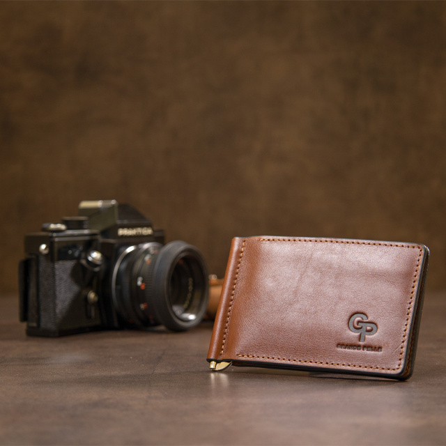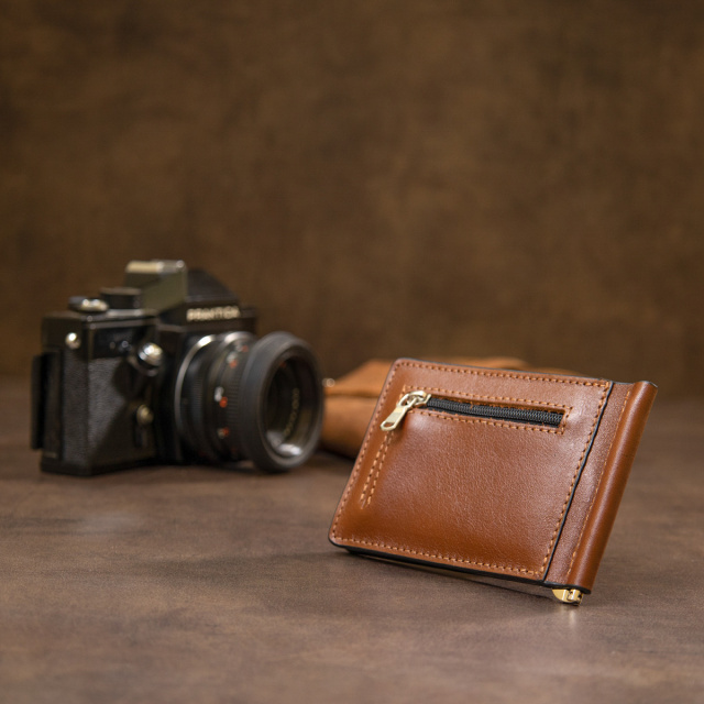 Чудовий затиск для грошей з натуральної шкіри для тих, кому набридли громіздкі класичні гаманці. Цей виріб має гарний коричневий колір і акуратні шви трохи світлішого відтінку. Всередині є слоти для карт і дві кишені, а на зовнішній стороні затиску розмістилася монетниця на блискавці, що дуже зручно і доступно. ОПЛАТА та ДОСТАВКА : накладний платіж з передоплатою 200 грн.Терміни відправлення : 1-3 робочих днів
