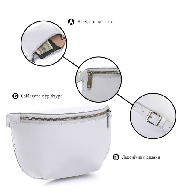 - шкіряний регульований ремінь. Чудова сумка на пояс для повсякденного використання або для подорожей. З такою сумкою Ваші руки будуть вільні, а телефон та інші цінні речі завжди при собі. Зроблено бананку з натуральної шкіри високого класу та підвищеної стійкості до зносу. Колір виробу – універсальний білий, фактура – гладка та приємна на дотик. ОПЛАТА та ДОСТАВКА : накладний платіж з передоплатою 200 грн.Терміни відправлення : 1-3 робочих днів