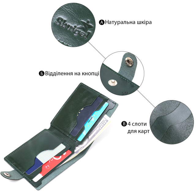 - 4 слоти для карток. Чудовий портмоне унісекс для поціновувачів негроміздких, але містких аксесуарів. Виконано воно з натуральної шкіри високого класу та покращеними показниками стійкості до зносу. Усередині помістяться купюри, а також банківські та візитні картки. Колір виробу – зелений, який виглядає дуже елегантно та красиво. ОПЛАТА та ДОСТАВКА : накладний платіж з передоплатою 200 грн.Терміни відправлення : 1-3 робочих днів