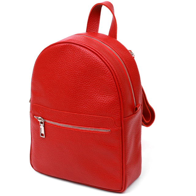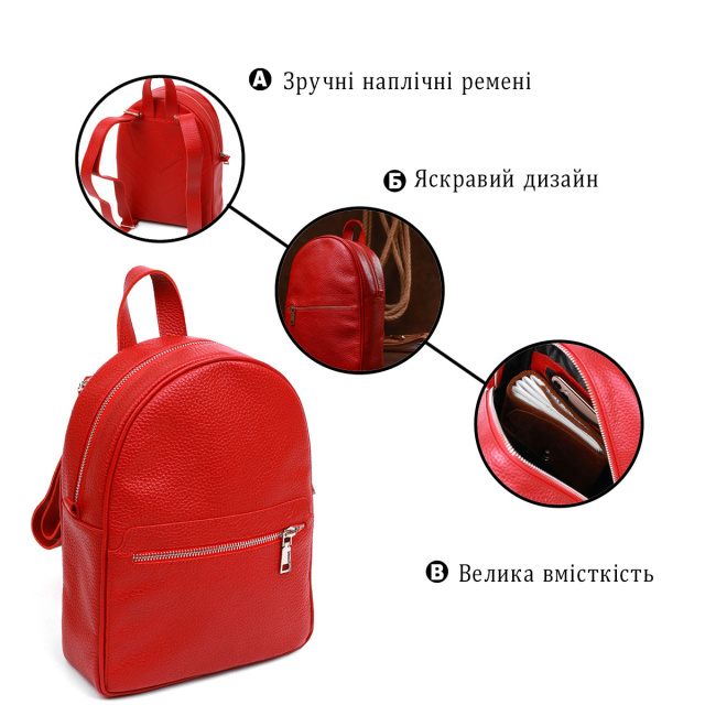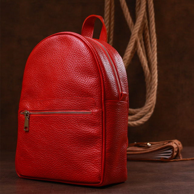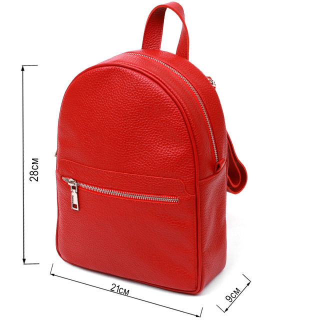- шкіряні регульовані шлейки та ручка для перенесення в руці. Чудовий жіночий рюкзак невеликого розміру з натуральної висококласної шкіри з покращеними показниками міцності та стійкості до зношування. Внутрішнє наповнення представлене у вигляді просторого основного відділення, двох кишень усередині та однієї зовні, що дуже зручно та практично. Колір виробу – насичений червоний, фактура – зерниста і дуже приємна на дотик. ОПЛАТА та ДОСТАВКА : накладний платіж з передоплатою 200 грн.Терміни відправлення : 1-3 робочих днів