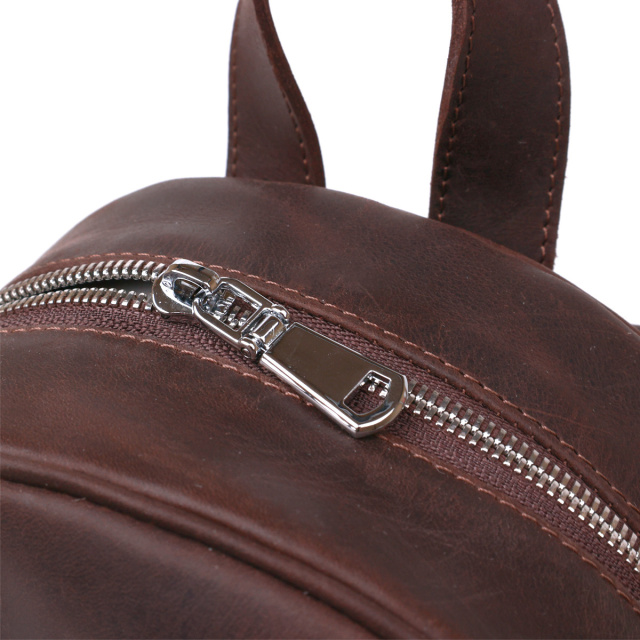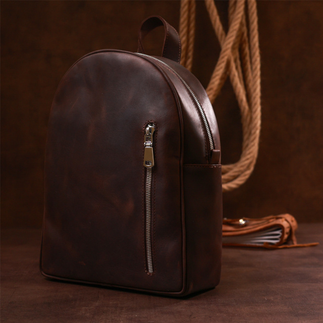 - шкіряні регульовані шлейки та ручка для перенесення в руці. Стильний та практичний жіночий рюкзак невеликого розміру для повсякденного використання. Матеріал виготовлення – натуральна міцна шкіра високої якості. Колір виробу - насичений коричневий, фактура - гладка вінтажна, що виглядає дуже красиво. Усередині є містке основне відділення та дві кишені, на зовнішній стороні також є вертикальна кишеня на блискавці. ОПЛАТА та ДОСТАВКА : накладний платіж з передоплатою 200 грн.Терміни відправлення : 1-3 робочих днів