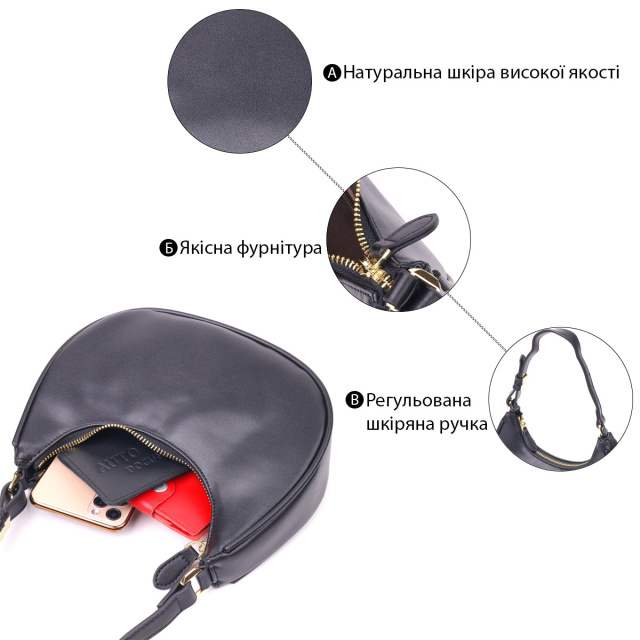 - не знімний регульований плечовий ремінь. Відмінна сумка з натуральної шкіри для справжніх модниць. Сумка каркасна, має напівкруглий формат, застібається на блискавку, всередині дві кишеньки, одна з них на блискавці. Металева фурнітура представлена у кольорі жовтого золота. Довжина ремінця 45 см, при бажанні можна зменшити на 10 см. Сумка відмінно підійде для повсякденного варіанту (для тих, хто любить невеликі сумки), а також і під вечірнє вбрання виглядатиме чудово. Вироби зі шкіри завжди вважалися чудовим подарунком. ОПЛАТА та ДОСТАВКА : накладний платіж з передоплатою 200 грн.Терміни відправлення : 1-3 робочих днів