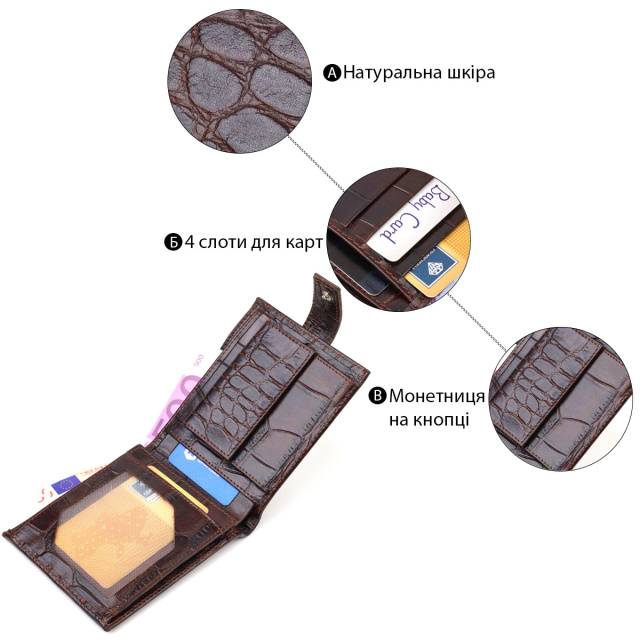 - гаманець упакований у фірмову коробочку; Цікавий чоловічий гаманець середнього розміру із натуральної фактурної шкіри з тисненням під крокодила. Аксесуар має основне відділення для купюр з перегородкою, чотири осередки для карток, дві кишені під сіточкою, три прилеглі кишені та монетницю. Гаманець складається навпіл, закривається хлястиком на кнопку. На лицьовій стороні в правому нижньому кутку розташований металевий логотип компанії виробника. Купуючи шкіряний гаманець у нашому магазині, Ви отримуєте модний, стильний аксесуар, який прослужить не один рік. ОПЛАТА та ДОСТАВКА : накладний платіж з передоплатою 200 грн.Терміни відправлення : 1-3 робочих днів