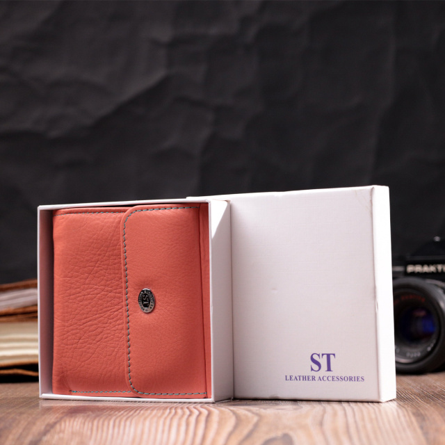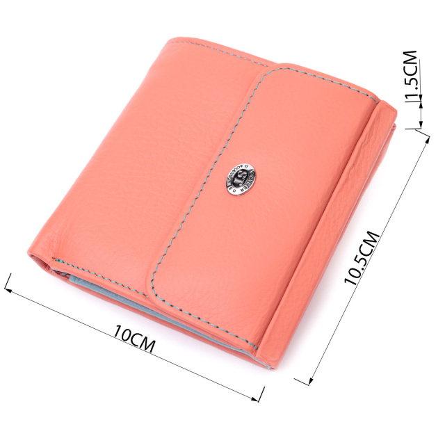 - закривається на магніт. Неординарне кольорове портмоне для жінок середнього розміру із натуральної шкіри найвищої якості. Акцентом цього гаманця є колір, точніше кілька кольорів – він помаранчевого кольору зовні та багатобарвний усередині. Аксесуар складається з двох містких відділень для купюр, кишені на блискавці, чотирьох осередків для карт, прихованої кишені, прозорої кишені та кишені для монет. Зовні виріб прошитий рівним рядком бірюзового кольору по краю і прикрашений металевим логотипом компанії виробника, який розміщений вгорі посередині. Портмоне доповнено надійною фурнітурою та міцною підкладкою. Укомплектований гаманець у фірмову картонну коробку білого кольору.