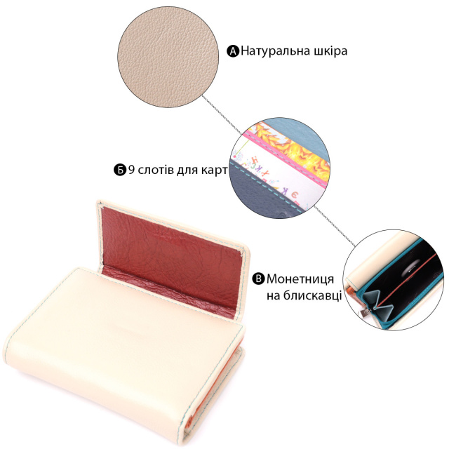 - закривається клапаном на магніт. Красивий жіночий гаманець подвійного додавання, що закривається на клапан з магнітом. Аксесуар виконаний з якісної натуральної шкіри, яка чудово носиться і не втрачає свого первісного вигляду з роками. Відмінна риса цієї моделі в яскравому внутрішньому забарвленні. Усередині є два відділення для купюр, дев'ять слотів для пластикових карток, дві приховані кишені та одна монетниця, що закривається на блискавку. Ідеальний аксесуар для любительок гаманців середнього розміру та практичного функціоналу. ОПЛАТА та ДОСТАВКА : накладний платіж з передоплатою 200 грн.Терміни відправлення : 1-3 робочих днів