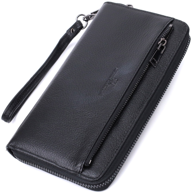 - закривається на блискавку. Місткий і практичний чоловічий портмоне-клатч із високоякісної шкіри чорного кольору для впевненого в собі чоловіка. Має все необхідне, щоб стати Вам незамінним аксесуаром у повсякденному житті. Ви легко помістите в нього паперові купюри, телефон, монети, документи і картки. Цей клатч можна носити як у сумочці чи портфелі, чи просто як самостійний аксесуар на зап'ястя за допомогою кистьового ремінця, чи просто в руці за допомогою ручки, яка знаходиться на тильній стороні. На лицьовій стороні посередині розташоване тиснення з логотипом виробника, що є запорукою якості виробу. Запакований аксесуар у білу щільну картонну коробку з фірмовим логотипом. Якщо Ви вирішите такий аксесуар подарувати близькій людині, то Вам гарантовано будуть дуже вдячні. ОПЛАТА та ДОСТАВКА : накладний платіж з передоплатою 200 грн.Терміни відправлення : 1-3 робочих днів