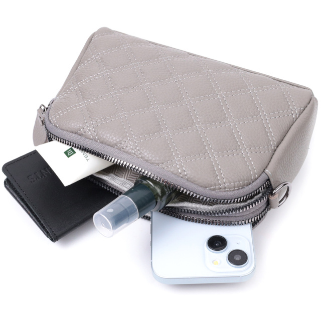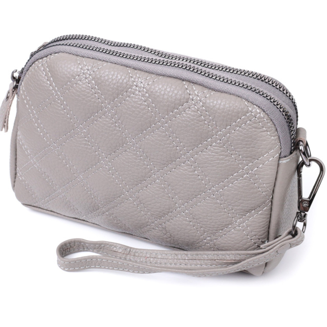 - знімний шкіряний ремінь. Зручна сумка для жінок із натуральної шкіри високої якості. Виріб дуже зручний, можна носити на плечі, руках і на кисті, для цього є шкіряний ремінець, що знімається і знімний кистьовий ремінь. На лицьовій стороні сумка прошита ромбами, що надає особливого шарму виробу. Модель доповнена фурнітурою кольору темного срібла. Аксесуар має два відділення, що закриваються на блискавки, дві кишеньки - одна на блискавці та одна відкритого типу всередині та одна кишеня на блискавці на тильній стороні. Якщо Вам потрібен варіант повсякденної сумки, яка відмінно підійде як вечірня, то ця модель ідеальний варіант. ОПЛАТА та ДОСТАВКА : накладний платіж з передоплатою 200 грн.Терміни відправлення : 1-3 робочих днів