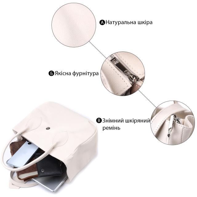 - дві міцні ручки для перенесення в руках. Жіноча сумка для тих, хто любить красивий дизайн без зайвих деталей. Така сумка стане надійним супутником для сучасної жінки, яка любить не лише стильні речі, а й функціональність. Колір виробу – благородний бежевий, фактура – зерниста. Матеріал виконання – натуральна шкіра з високими показниками якості. Носити сумку можна в руках і на плечі для цього передбачені дві міцні шкіряні ручки і регульований знімний плечовий ремінь. Відмінний варіант сумки на кожен день, адже вона не тільки приваблива зовні, але й оснащена розумною системою внутрішніх відділень, що дозволить організувати простір усередині. Також у виробі використано якісну фурнітуру срібного кольору. ОПЛАТА та ДОСТАВКА : накладний платіж з передоплатою 200 грн.Терміни відправлення : 1-3 робочих днів