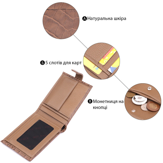 - виріб упакований у фірмову коробку. Зручний чоловічий гаманець із натуральної шкіри із тисненням під крокодила, у красивому коричневому кольорі. Виріб закривається на хлястик із кнопкою. На лицьовій стороні у вигляді декору розташований логотип виробника. Аксесуар упакований у фірмову коробочку. Вироби з натуральної шкіри завжди будуть чудовим подарунком для близької людини. ОПЛАТА та ДОСТАВКА : накладний платіж з передоплатою 200 грн.Терміни відправлення : 1-3 робочих днів