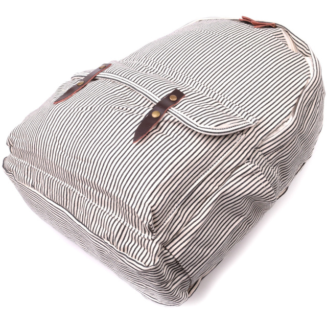 - без підкладки. Універсальний рюкзак молочного кольору у чорну вертикальну смужку із якісного текстилю. Рюкзак дуже місткий та має дуже практичний функціонал. Носити виріб можна в руках, для цього передбачена текстильна ручка, а також на спині завдяки текстильним лямкам, що регулюються. Фурнітура яка використана у рюкзаку якісна, прослужить не один рік.