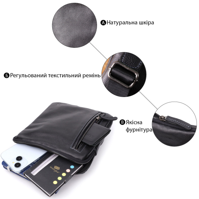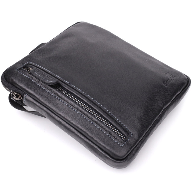 Особливості: - одне основне відділення на блискавці; - всередині: кишеня на блискавці, відкрита кишеня та осередок для кредитних карток; - зовні: вертикальна кишеня на блискавці на лицьовій стороні та кишеня на блискавці на тильній стороні; - незнімний регульований текстильний ремінь; - фурнітура під срібло; - фірмове тиснення логотипу на лицьовій стороні. Ця чоловіча вертикальна сумка виготовлена з натуральної зернистої шкіри класичного чорного кольору. Завдяки міцній текстурі та акуратній обробці аксесуар виглядає стильно та універсально, легко поєднуючись із діловим та повсякденним чином.