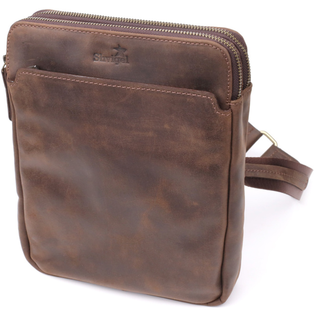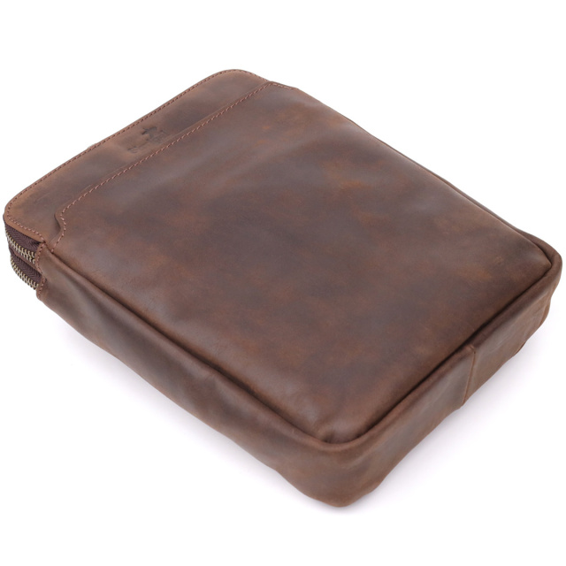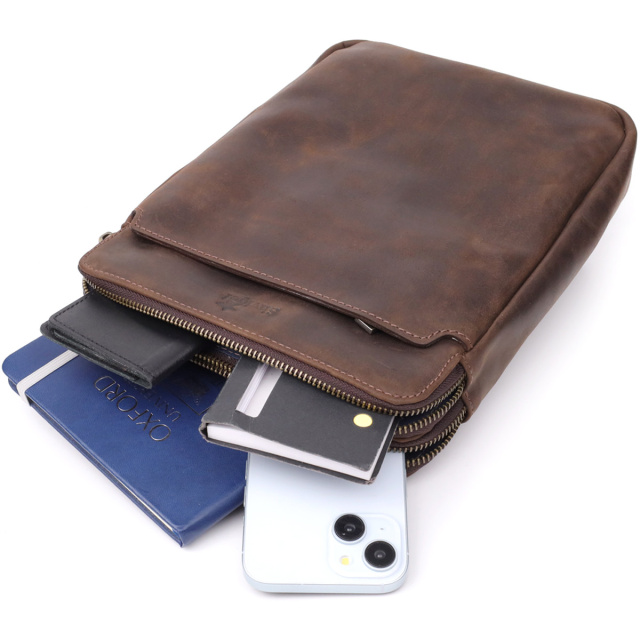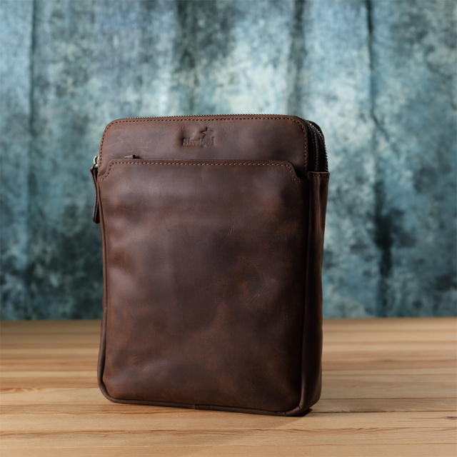 Особливості: два основні відділення на блискавці; всередині: кишеня на блискавці та відкрита кишеня для телефону, ключів та дрібниць; зовні: кишеня на блискавці на лицьовій стороні та кишеня на магніті на тильній стороні; міцний текстильний ремінь із шкіряними вставками; фірмове тиснення логотипу на лицьовій стороні; фурнітура кольору латунь. Чоловіча вертикальна сумка від українського бренду виконана з натуральної вінтажної шкіри, яка згодом набуває благородного нальоту та підкреслює характер виробу. Компактні розміри та продумана організація внутрішнього простору дозволяють зручно розмістити документи, планшет чи особисті речі.