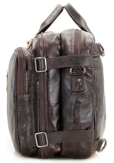 Колір: коричневий. Чоловіча сумка-трансформер з натуральної шкіри. При виготовленні аксесуара використовувалася надійна фурнітура та якісна підкладка. Сумку можна носити в руці, через плече, а також як рюкзак. Сумка має благородних коричневий колір і стильний зовнішній вигляд. У такий аксесуар поміститься більшість речей, які потрібні сучасній людині. Особливості: