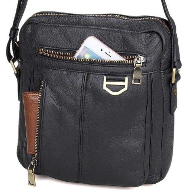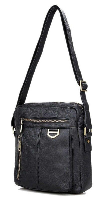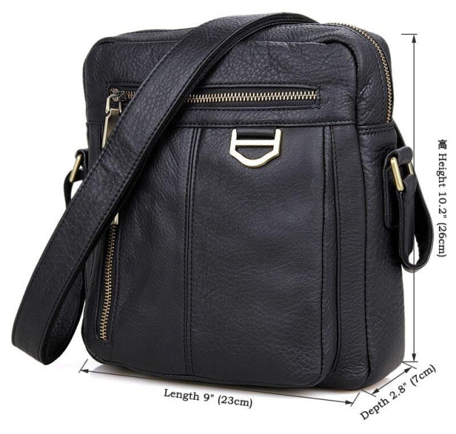 Розміри (ШхВхГ, см): 23х26х7. Добротна чоловіча сумка через плече з натуральної шкіри. Колір фурнітури: латунь. Сумка акуратно прошита міцною ниткою чорного кольору. На лицевій стороні розташовано два відділення на блискавці. Ще одне відділення на блискавці розташоване на задній зовнішній стороні. Дана модель закривається за допомогою блискавки. Сумка упакована в текстильний пилозахисний чохол білого кольору. Всередині: