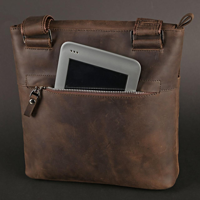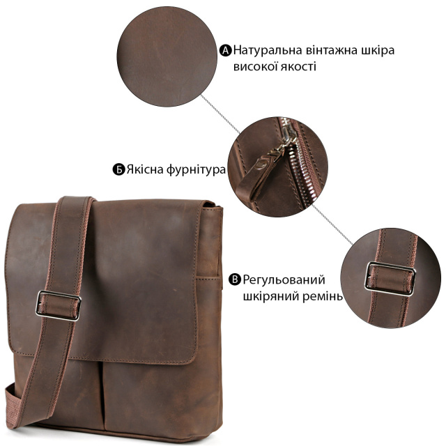 Країна виробник: Україна. Сумка середніх розмірів з натуральної шкіри для чоловіків, які щодня носять з собою багато дрібних речей (ключі, телефон, блокнот, портмоне, невеликий планшет, і т.д.). Сумочка досить вмістка і функціональна для своїх розмірів, закривається за допомогою клапана на магнітах, для додаткового захисту речей, під ним відділення на блискавці. При відкритті клапана сумки, є дві великі накладні кишені та вшита кишеня на блискавці, які дуже добре вписуються в дизайн виробу. Основне відділення на блискавці і досить вмістке. Всередині є прихована кишеня, яка закривається блискавкою. На задній зовнішньої стінці є кишеня для дрібних речей на блискавці. Сумка повністю пошита з натуральної вінтажної (під старовину) шкіри, має регульований ремінь, який не знімається . Фурнітура найвищої якості, буде служити своєму власникові дуже довгий час. Внутрішнє оздоблення з міцного, надійного текстилю.