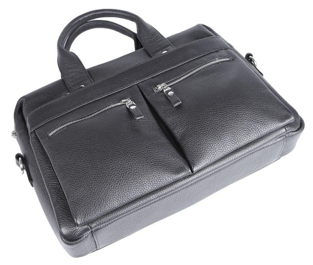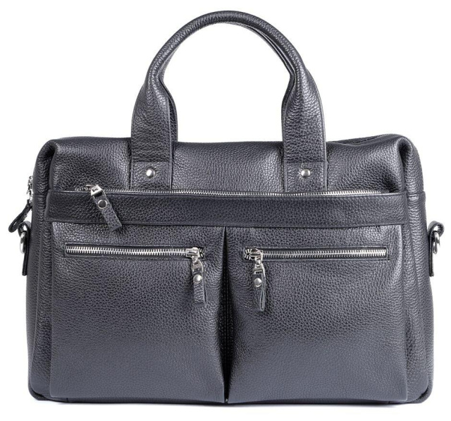 Країна виробництва: Україна. Високоякісна чоловіча сумка з відділенням для невеликого ноутбука. Аксесуар виконаний з натуральної приємної на дотик шкіри чорного кольору. На лицевій стороні даного виробу розташоване одне відділення і дві кишені на блискавках. На задній зовнішній стороні знаходиться ще одне відділення на блискавці. Сумку можна переносити в руці за допомогою зручних шкіряних ручок, а також через плече (в комплекті є регульований плечовий ремінь, який виконаний в комбінації текстильного матеріалу та натуральної шкіри). Колір фурнітури: срібло. Всередині: