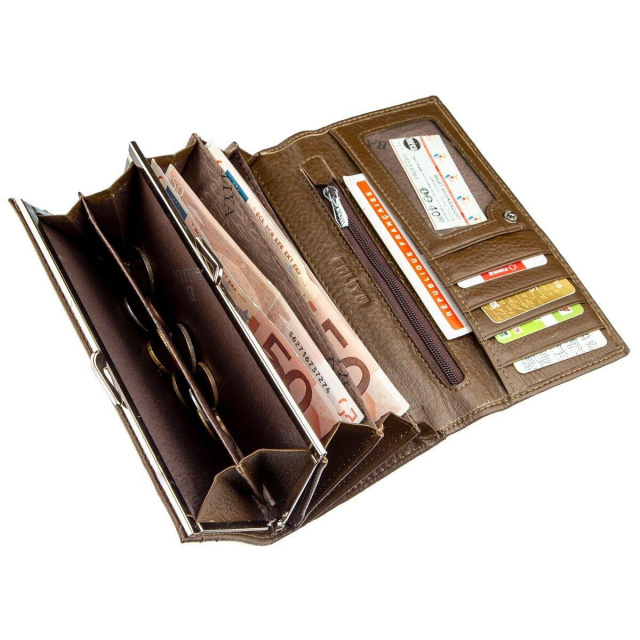 Відкрита кишеня. Стильний і в той же час лаконічний дизайн оцінить будь-яка дівчина. Гаманець виконаний в коричневому кольорі з зеленуватим відтінком. Модель горизонтального плану має оптимальний функціонал і правильно підібрані розміри. По краях аксесуар прошитий рівним рядком. Гаманець прекрасно підійде в якості подарунку для будь-якої дівчини. Виріб упаковано в картонну коробку червоного кольору.