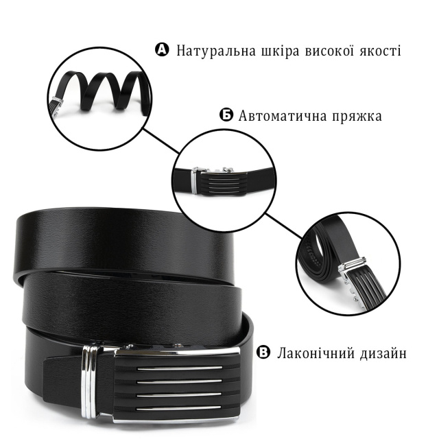 Довжина: 105-120 см (регулюється в меншу сторону) Якісний ремінець з натуральної шкіри і цільного полотна. Модель доповнена оригінальною пряжкою, яка поєднує чорний колір і сріблясті смужки. Пряжка надає ремінцю особливого шарму і додає індивідуальності. Ремінь підійде під джинси і брюки. Пряжка автомат дуже зручна і довгий час не виходить з ладу. Якщо ви в пошуках якісного ременя - рекомендуємо вам дану модель. А також ви можете придбати ремінець на подарунок чоловікові. Впевнені, що цей продукт не залишить його байдужим. ОПЛАТА та ДОСТАВКА : накладний платіж з передоплатою 200 грн.Терміни відправлення : 1-3 робочих днів