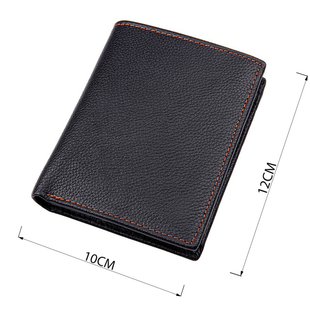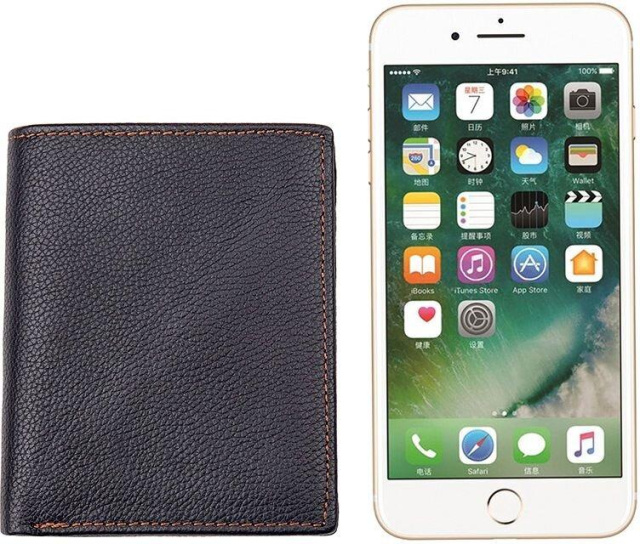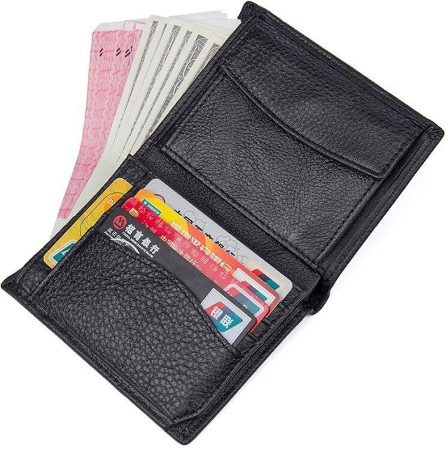 - три потаємні кишені. Стильний чоловічий шкіряний гаманець чорного кольору. Аксесуар акуратно прошитий надміцною ниткою світло-коричневого кольору, що надає йому родзинку. Гаманець упакований в текстильний пилозахисний чохол білого кольору.