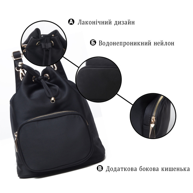 - лямки з регуляторами довжини, які знімаються. Сучасний жіночий рюкзак компактного розміру на кожен день. Аксесуар має оригінальний класичний дизайн, який не прив'язує вас до певного стилю. Модель доповнена блискучою золотистою фурнітурою і дуже приємна на дотик. В аксесуар легко поміститься косметичка, гроші, щоденник або улюблена книга, а також інші необхідні жіночі дрібниці. Дуже хороша модель на кожен день. Рюкзак виконаний з щільного нейлону і прослужить вам порівняно довго. Незважаючи на свій невеликий розмір аксесуар дуже вмісткий і зручний. Рюкзак буде ідеальним подарунком для будь-якої дівчини. ОПЛАТА та ДОСТАВКА : накладний платіж з передоплатою 200 грн.Терміни відправлення : 1-3 робочих днів