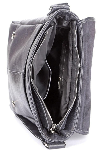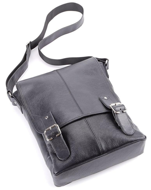 Країна виробництва: Україна. Велика шкіряна чоловіча сумка найвищої якості. Аксесуар виконаний зі шкіри чорного кольору. Шкіра м'яка, приємна на дотик. Колір фурнітури: срібло. Сумка акуратно прошита надміцною ниткою чорного кольору. На задній зовнішній стороні аксесуару розташоване відділення на блискавці. Дана модель носитися через плече. Плечовий ремінь виконаний в комбінації натуральної шкіри і міцного текстильного матеріалу. Сумка закривається за допомогою клапана і 2-х шкіряних хлястиків на магнітних кнопках, а також блискавкою. Під клапаном знаходиться вмістка накладна кишеня. Підкладка виконана з міцного текстильного матеріалу чорного кольору. Всередині: