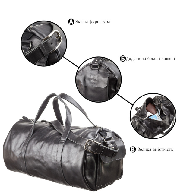 Розмір (ШхВхГ, см.): 55х31х24. Ексклюзивна сумка виконана виключно з цільної якісної шкіри. Поєднує в собі мінімалізм і функціональність. Вся фурнітура вищої якості ідеально поєднується з вишуканою шкірою. У сумці немає картону, немає підкладкових тканин, форма виробу зберігається завдяки пружності самої цільної шкіри. Завдяки цьому виріб має високу зносостійкість і благородний зовнішній вигляд. Особливості: - всередині одне вмістке відділення, закривається на блискавку; - дві додаткових кишені на магнітах з боків сумки; - оригінальний дизайн. Виріб прикрашено логотипом виробника; - дві укріплені міцні шкіряні ручки, для зручного носіння в руках; - комплектується шкіряним ременем для носіння через плече; - шиється вручну з цільного шматка шкіри руками досвідченого майстра; - виробництво Україна; - матеріал: натуральна потовщена теляча шкіра гладкої фактури. У виробництві використана шкіра італійського виробництва. Відмінна сумка для людей, які багато подорожують і активно займаються спортом. Така шкіряна сумка зручна і вмістка, а завдяки матеріалам, що використовуються і дизайну, перетворюється в статусний аксесуар.