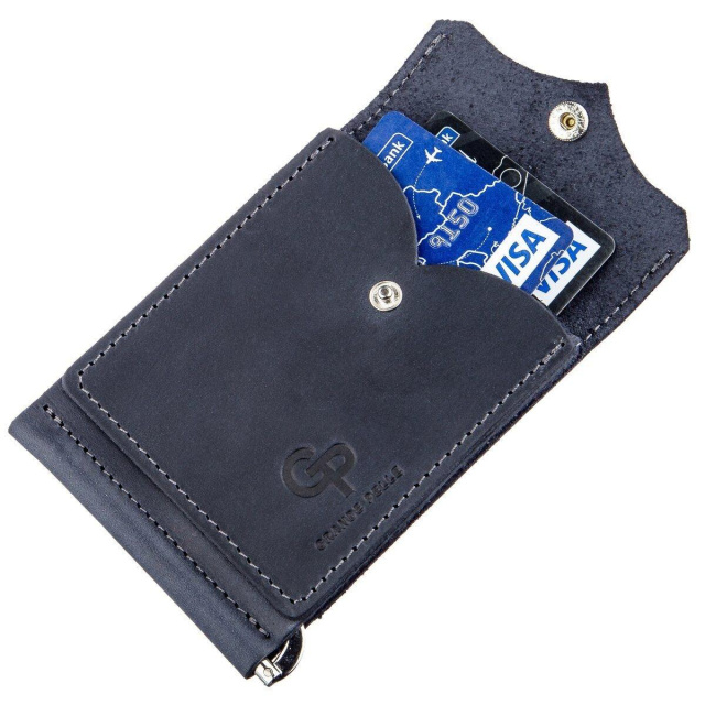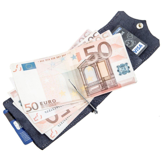 Компактний зажим з італійської натуральної шкіри найвищої якості синього кольору. На лицьовій стороні аксесуара є тиснений логотип бренду-виробника і рівний синій рядок по краях аксесуара. Затиск стане для вас ідеальним рішенням, якщо ви не є шанувальником портмоне або клатчу. За рахунок свого компактного розміру затиск легко поміститься в кишеню або невелику сумку. Ви також можете покласти в нього пару необхідних кредиток. Сама конструкція затискачу виготовлена з надійного металу. Виріб стане прекрасним подарунком для близької людини. Модель упакована в повстяний чохол.