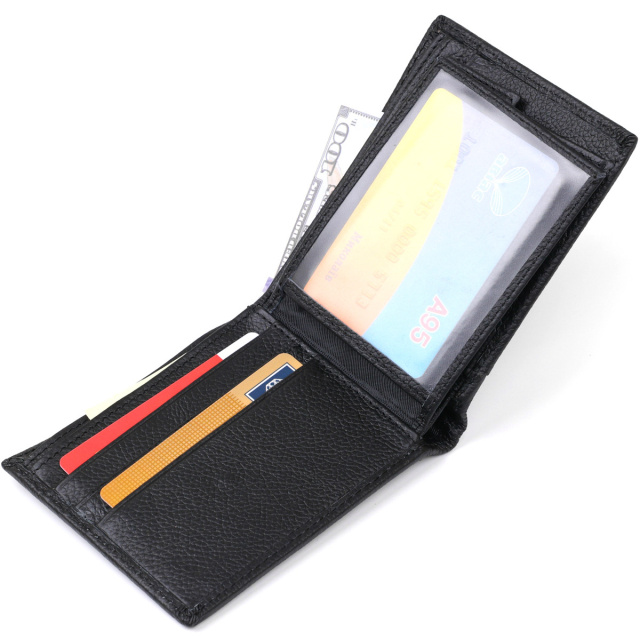 - 2 прозорі кишені. Компактне чоловіче портмоне з натуральної висококласної шкіри з відмінними характеристиками експлуатації. Має місткі відділення для купюр, слоти для кредитних та візитних карток, а також невелику монетницю на кнопці. Такий гаманець легко поміститься у сумці чи кишені. Колір виробу – чорний, фактура – матова. ОПЛАТА та ДОСТАВКА : накладний платіж з передоплатою 200 грн.Терміни відправлення : 1-3 робочих днів