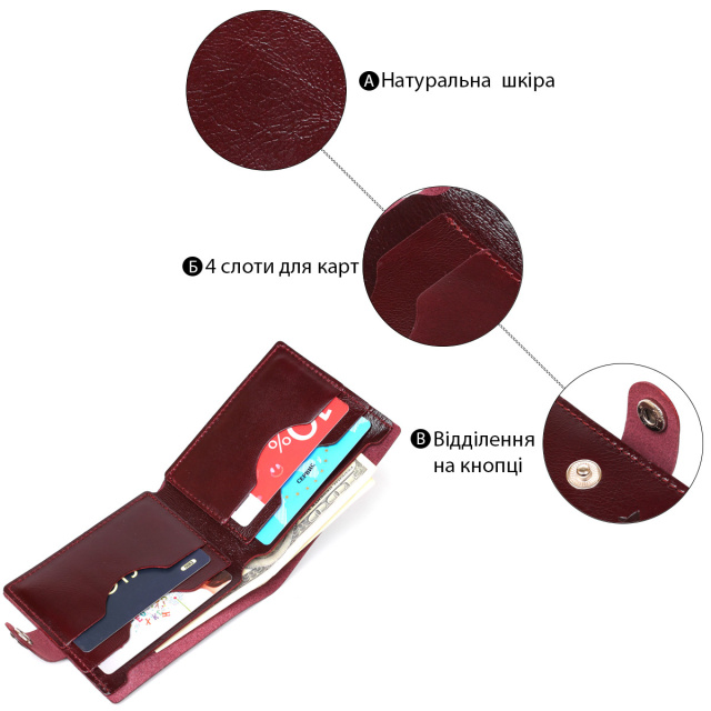 - 4 слоти для карток. Стильне портмоне з натуральної високоякісної шкіри з покращеними показниками зносостійкості. Має дуже гарний темно-вишневий колір, що дуже цікаво. Фактура виробу – гладка з легким переливом. Усередині є містке основне відділення та кілька слотів для пластикових карток. ОПЛАТА та ДОСТАВКА : накладний платіж з передоплатою 200 грн.Терміни відправлення : 1-3 робочих днів