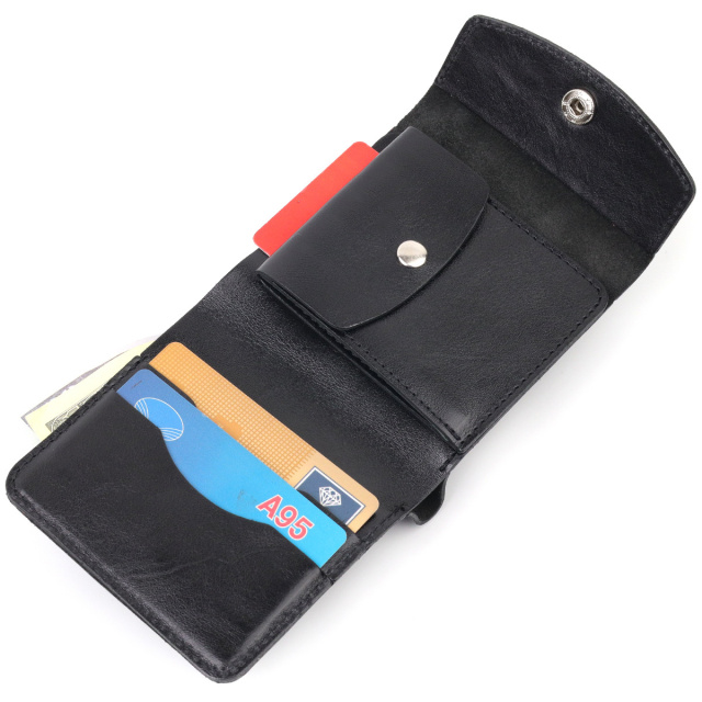- Монетниця на кнопці. Компактний гаманець чорного кольору, маленького розміру, який легко поміститься навіть у найменшу сумку. Аксесуар не займе багато місця та не має зайвої ваги. Закривається гаманець хлястиком із кнопкою. Зовні та всередині виріб виготовлено з натуральної глянсової шкіри. На лицьовій стороні гаманець прикрашений тисненим логотипом . Добротна натуральна шкіра прослужить Вам дуже довго. ОПЛАТА та ДОСТАВКА : накладний платіж з передоплатою 200 грн.Терміни відправлення : 1-3 робочих днів