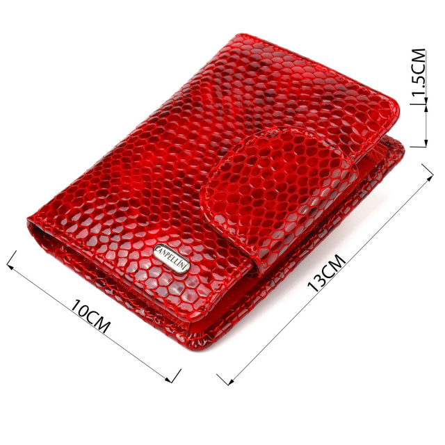 Лакований гаманець для жінок компактного розміру з натуральної шкіри, з тисненням під змію. Аксесуар має відділення для купюр з перегородкою, монетницю, що закривається клапаном на кнопку, приховану кишеню та сім відсіків для карток, два з них під сіточкою. Закривається аксесуар у два складання хлястиком на кнопку. Якісний шкіряний аксесуар завжди вважався показником смаку та достатку, саме такі вироби представлені у нашому магазині, у нас кожен знайде щось для себе. ОПЛАТА та ДОСТАВКА : накладний платіж з передоплатою 200 грн.Терміни відправлення : 1-3 робочих днів