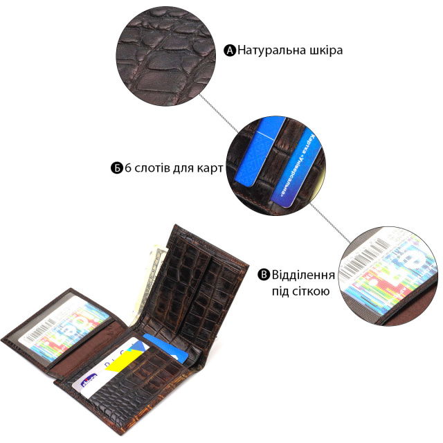 - гаманець упакований у фірмову коробочку. Місткий чоловічий гаманець із натуральної фактурної шкіри, з тисненням під крокодила, в оригінальному кольорі. Аксесуар має одне основне відділення з тканинною перегородкою, в яке поміщаються купюри всіх номіналів, шість кишень для карток, кишеня під сіточкою для пропуску, одна прихована кишеня і монетницю. Закривається аксесуар навпіл, без застібки. На лицьовій стороні, у правому нижньому куті металевий логотип компанії виробника. Купуючи шкіряний аксесуар цієї фірми, собі чи на подарунок, будьте певні, що він прослужить Вам не один рік. ОПЛАТА та ДОСТАВКА : накладний платіж з передоплатою 200 грн.Терміни відправлення : 1-3 робочих днів