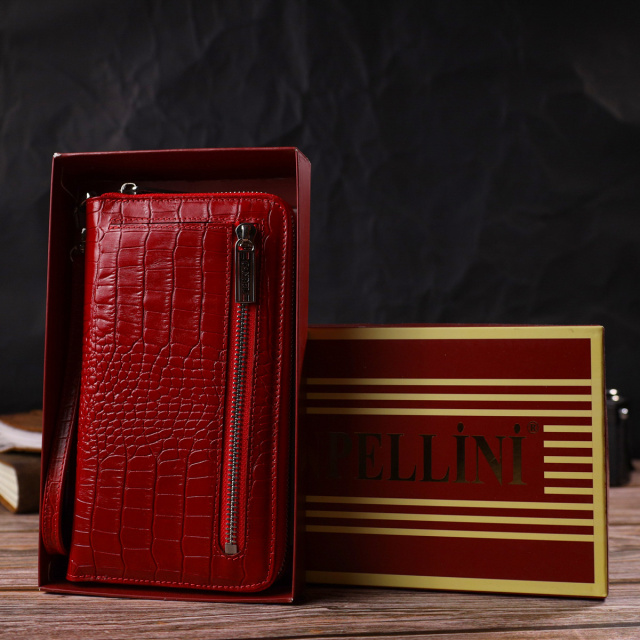 - гаманець упакований у фірмову коробочку. Яскравий жіночий клатч із натуральної лакованої шкіри, з тисненням під крокодила. Аксесуар має велике відділення для купюр, 15 осередків для карток (один під сіточкою), кишеню-перегородку на блискавці, три прилеглі кишені, кишеню з розширювачем на блискавці зовні та тримач для ручки. Носити цю модель зручно в руці або за допомогою знімного кистьового ременя. Закривається аксесуар на блискавку. Купуючи шкіряний аксесуар цієї фірми собі або на подарунок, будьте певні, що він радуватиме око не один рік. ОПЛАТА та ДОСТАВКА : накладний платіж з передоплатою 200 грн.Терміни відправлення : 1-3 робочих днів