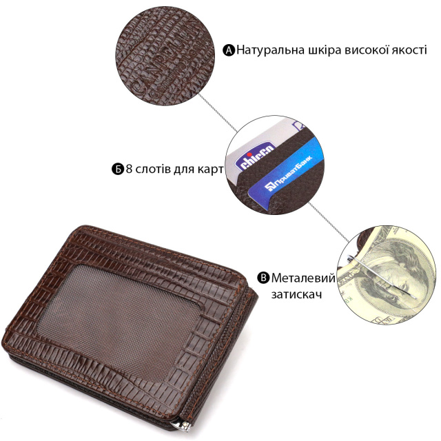 - виріб упакований у фірмову коробку. Красивий чоловічий затискач для купюр виконаний із фактурної натуральної шкіри із тисненням. Купюри фіксуються металевим тримачем, також аксесуар має вісім осередків для карт, два з яких під сіточкою та одну приховану кишеню. Закривається шкіряним хлястиком у петельку. Користь затиску полягає в тому, що він набагато компактніший, ніж гаманець, легко поміщається в руку або кишеню. Аксесуар упакований у фірмову коробочку. Вироби з натуральної шкіри завжди будуть чудовим подарунком для близької людини. ОПЛАТА та ДОСТАВКА : накладний платіж з передоплатою 200 грн.Терміни відправлення : 1-3 робочих днів