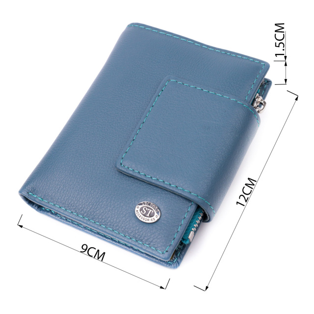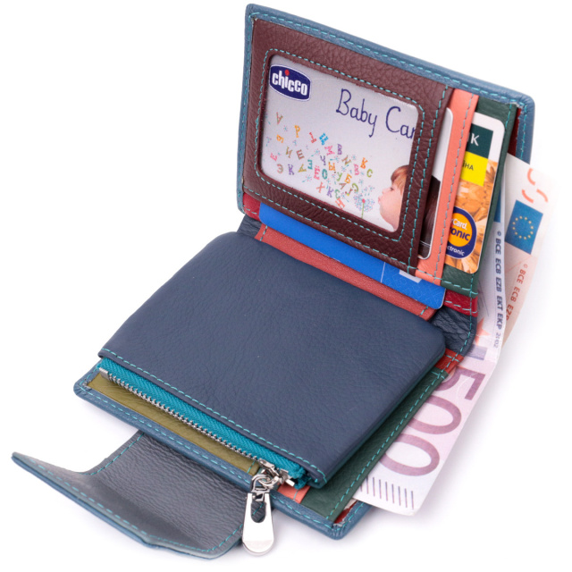 - закривається хлястиком на магніт. Цікаве вертикальне портмоне в два додавання зручного розміру з натуральної шкіри найвищої якості. Гаманець сіро-бірюзового кольору зовні та різнобарвний усередині, що дуже стильно та сучасно. Шкіряне портмоне дуже практичне і служить досить довго. Аксесуар складається з основного відділення зі шкіряною перегородкою для купюр, монетниці, чотирьох осередків для карт, прозорого віконця для пропуску та чотирьох прихованих кишень. Портмоне доповнено надійною фурнітурою і прошито по краю рівним рядком бірюзового кольору. Укомплектований гаманець у фірмову картонну коробку білого кольору. Виріб стане ідеальним подарунком для дівчини будь-якого віку.